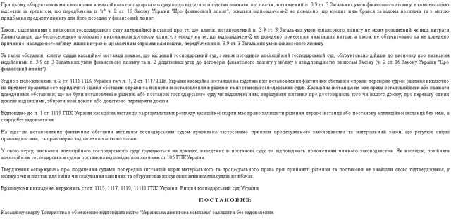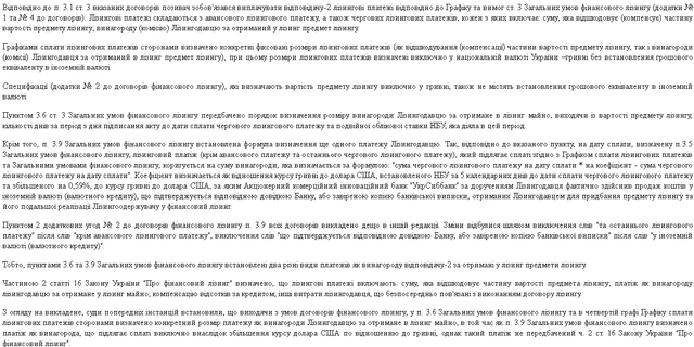 Суть справи: Клієнт – юридична особа (сільгоспвиробник України) звернувся з питанням надання правової допомоги перед лізинговою компанією ТОВ «Українська лізингова компанія» (входила до групи компаній BNP Paribas Group у зв'язку з тим, що компанія виставляє рахунки і нараховує суму лізингових платежів з урахуванням курсової різниці з прив'язкою до поточного комерційним курсом ПАТ «УкрСиббанк», що призвело до фактичного збільшення ціни всіх 6-ти укладених договорів майже на 80% від початкової. При простроченні платежу за «курсової різниці», несплати її в повному обсязі, наступали негативні наслідки у вигляді штрафних санкцій, а також розірвання договору фінансового лізингу і повернення предмета лізингу (сільгосптехніки), а також втрата раніше сплачених лізингових платежів.