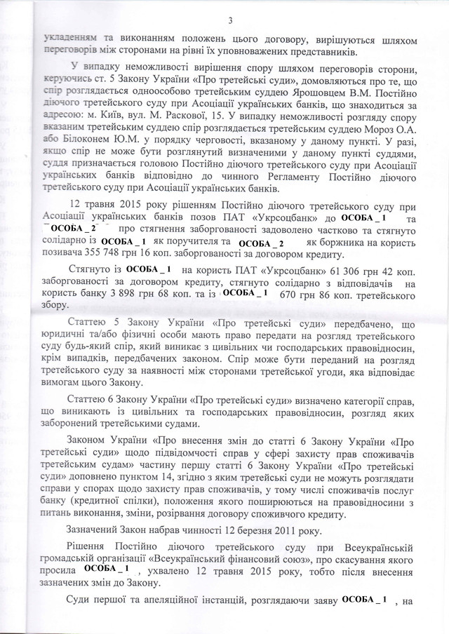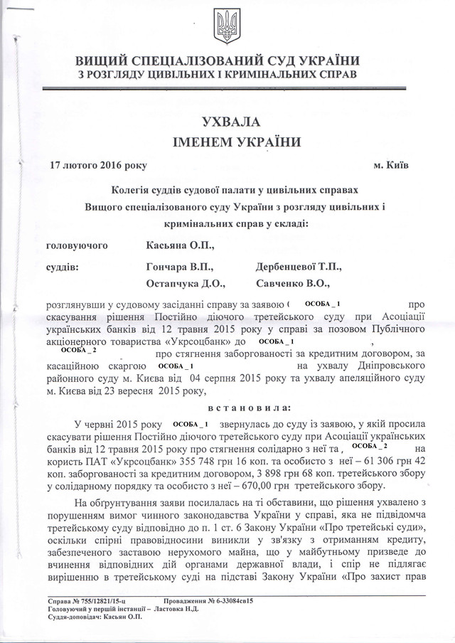 Виграно справу проти Постійно діючого третейського суду при Асоціації українських банків. Касаційна скарга про скасування рішення Постійно діючого третейського суду при Асоціації українських банків задоволена.