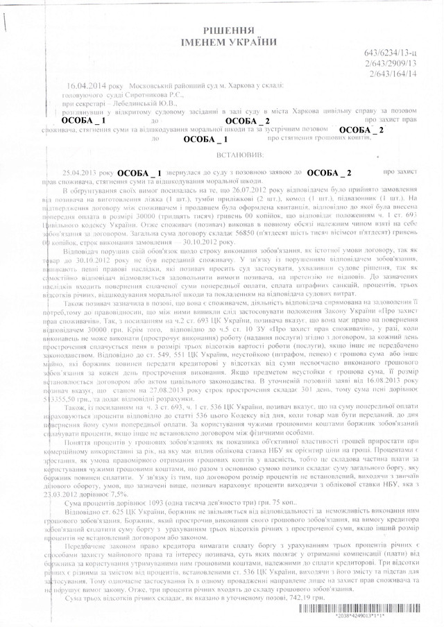 Суть спора: Клиент обратился к адвокату в связи с тем, что его права потребителя были нарушены, так как ответчик не выполнил обязательство по договору в срок, предусмотренный Законом Украины "О защите прав потребителей". Нарушение прав потребителя также привело к к причинению вреда неимущественного характера. Данный спор необходимо решить в судебном порядке, с чем и обратилсся клиент к адвокату Павлу Лыска.